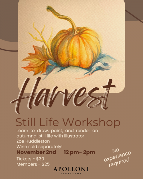 Illustrator and artist Zoe Huddleston will guide you through the fundamentals of drawing from a still life arrangement, watercolor painting, and rendering. Take home a beautiful piece of art while you enjoy the beautiful fall colors at Apolloni Vineyards!