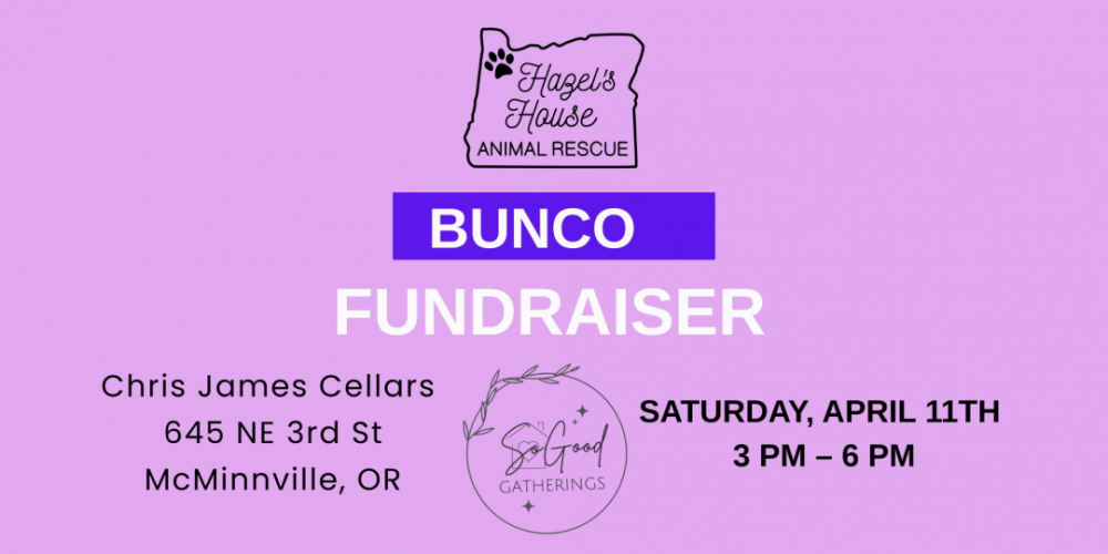 On Saturday, April 11 from 3 to 6 PM, we're gathering at Chris James Cellars in McMinnville for a Bunco fundraiser benefiting Hazel's House Animal Rescue.