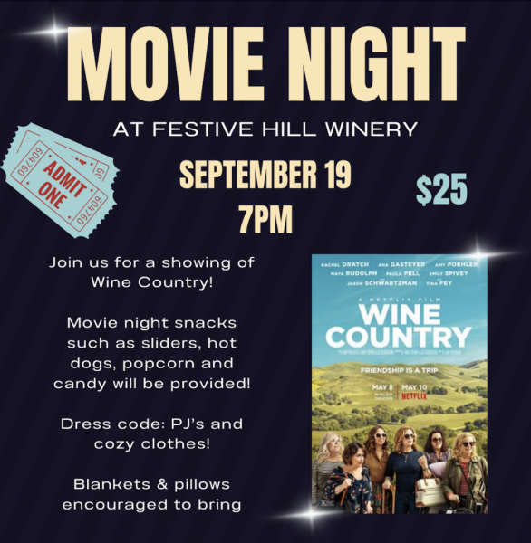 Join us for movie night at the winery! We will host a showing of Wine Country (Rated R) alongside classic movie theater snacks like sliders, hot dogs, popcorn, and candy. Dress code is PJ's and cozy clothes! See you at the movies!