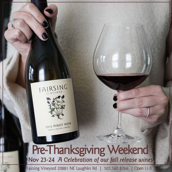 Join Fairsing for a celebration of fall release wines throughout the Pre-Thanksgiving weekend November 23 and 24 between 11 am - 5 pm.
