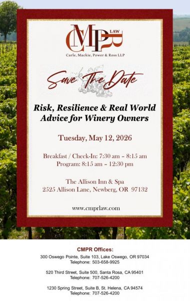 Join leading wine industry attorneys, winery owners, and professionals for a half day program exploring legal, financial, and operational strategies to navigate today’s challenges, stabilize operations, protect assets, and position wineries for long-term success in the new wine economy. Registration link and details will be on our website in the coming weeks: https://cmprlaw.com/risk-resilience-real-world-advice-for-winery-owners. A formal invitation listing topics and panelists will follow our Save-the-Date e-blast by early April. If you did not receive a Save-the-Date and would like to be added to our mailing list for this and future events, please send your email address to Karen at kbrasel@cmprlaw.com. We look forward to seeing you in May at The Allison!