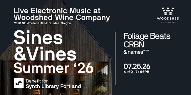 Sines and Vines is a summer concert series in the Dundee Hills. Join us for a night of original electronic music in the Woodshed tasting room, performed live by lofi hiphop artist Foliage Beats and dub techno artist CRBN, with a DJ set by Names. Along with the live music, we'll have glass pours of our most popular Woodshed wines for sale along with N/A beverages and other fun treats.