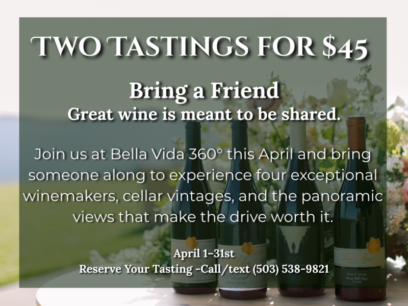 As we ease out of winter and into the promise of a new season, April is the perfect time to gather, slow down, and enjoy a glass (or two) with someone you enjoy spending time with. It’s the perfect excuse to introduce someone new to Bella Vida 360°, catch up with an old friend, or simply take in the panoramic views while enjoying wines from our four exceptional winemakers and cellar vintages. Bring a friend. Share a bottle. Stay awhile.