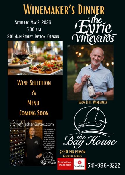 Join us for our second fabulous Winemaker’s Dinner on Saturday, May 2, 2026. JASON LETT, Winemaker from the EYRIE VINEYARDS and our Executive Chef, NATHAN BATES, are excited to “pair up” and present a fantastic wine and culinary experience! ❤️🍷Relax in the comfort of our cozy and romantic dining room while we provide an evening of world class hospitality! Reservations made easy on OPENTABLE. 541-996-3222