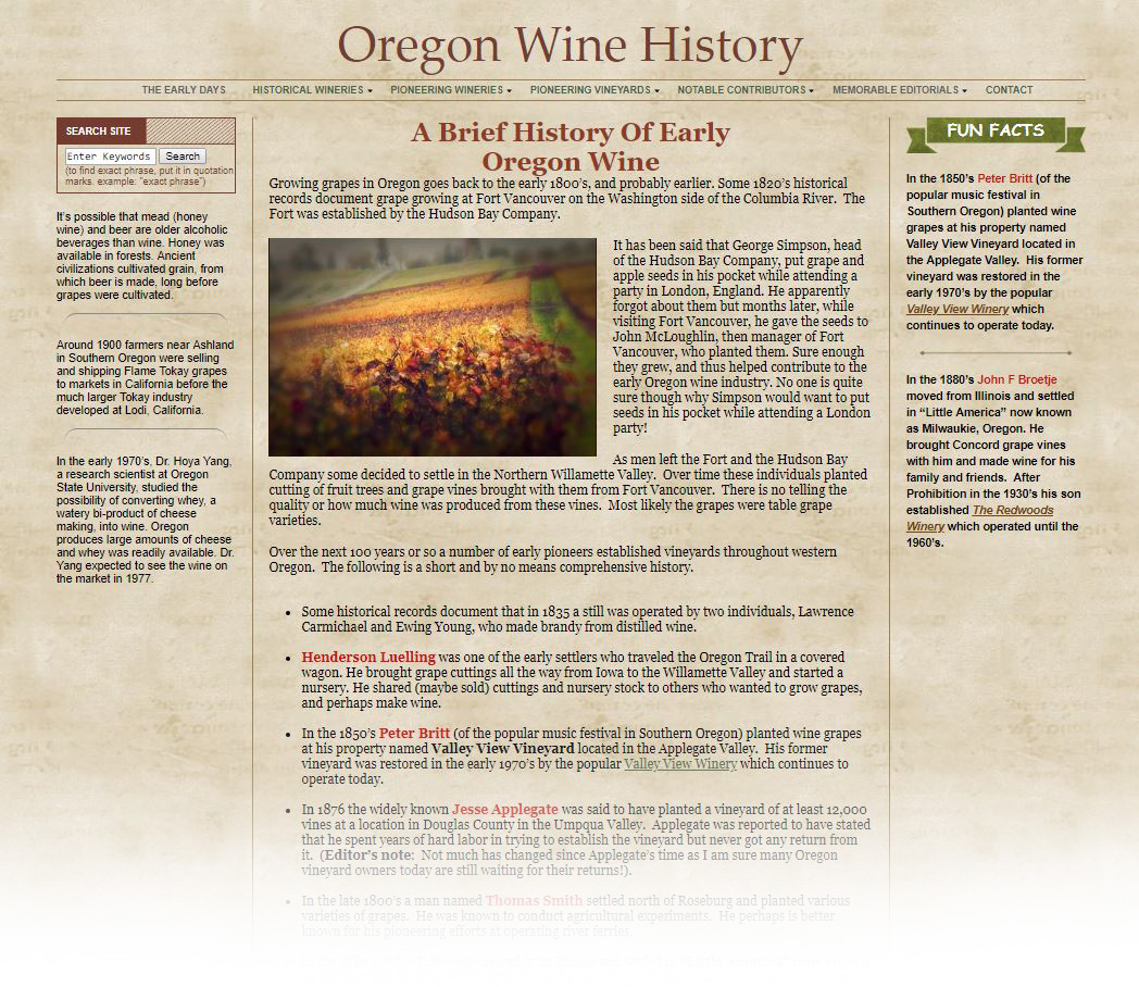 Herb Sims, a Dundee vineyard and winery co-owner, researched and created oregonwinehistory.com, which begins with a chronological history of early Oregon winegrowers. The site also traces the development of the state’s industry through summaries of many early, but not always well-known, pioneering wineries and vineyards, as well as notable industry contributors.